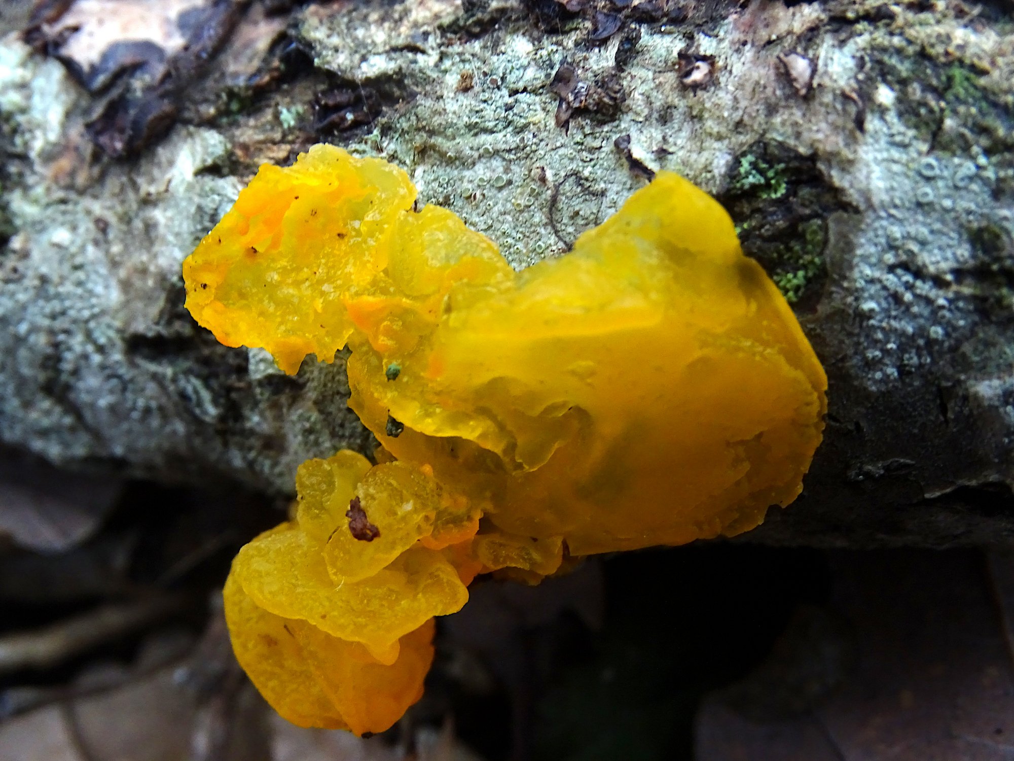 Celle-ci poussait sur une branche sans aucun Stereum nulle part mais par contre avec une croûte de couleur violacée à plusieurs endroits. D'où la conclusion en faveur de Tremella mesenterica.