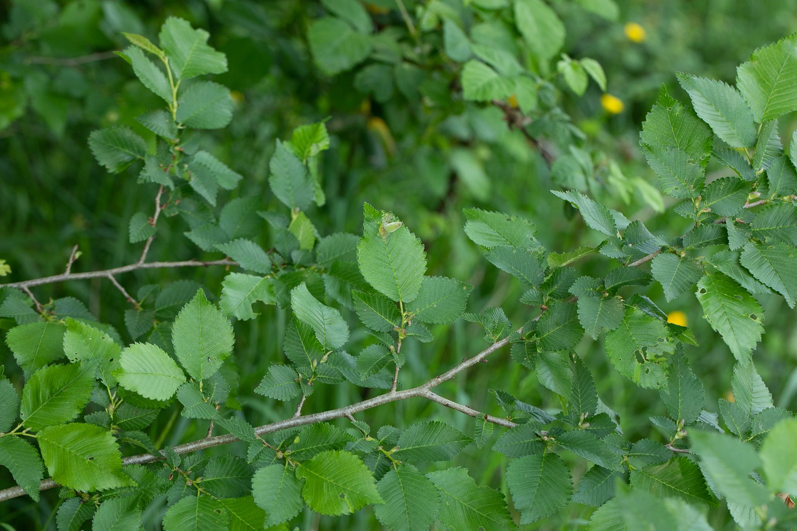 Je pense qu'on peut éliminer Ulmus glabra qui a des feuilles à pointe plus effilée, souvent avec de grandes pointes latérales, dont la plus grande largeur se situe au-dessus du milieu