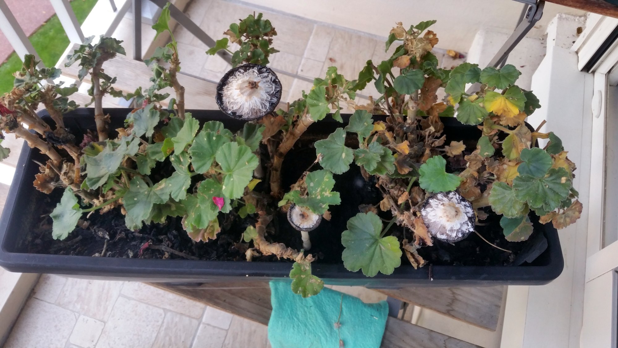 - dans un bac de géraniums. Je partais vers les Coprinopsis à voile filamenteux mais la présence du petit anneau m'a ramené vers les Coprinus. Vu la hauteur (15 cm) et l'absence d'odeur détectée, je me demande si ce n'est pas tout simplement Coprinus comatus. Qu'en pensez-vous ?