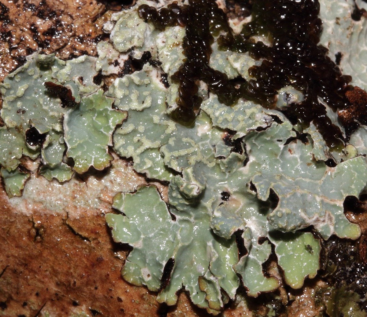 Quant à la frullaine, je la rencontre pratiquement sur tous les arbres de mes relevés. Les lichens ont l'air de très bien composer avec elle, contrairement aux autres mousses, mais pour l'observateur ça peut poser un problème car on la dit très allergène. Comme je ne me suis jamais frotté les yeux après avoir prélevé des lichens associés à elle, je ne confirme pas, mais la méfiance est conseillée ... ou alors un bon collyre dans la poche du naturaliste