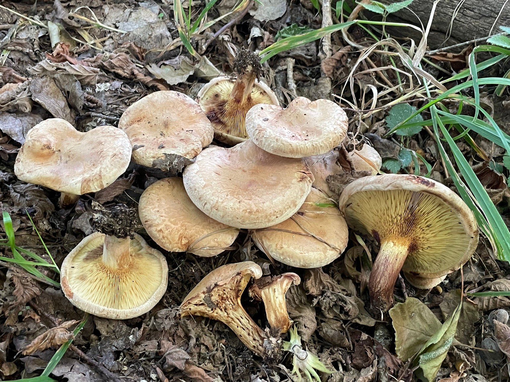 Paxillus ammoniavirescens (ex validus) a un port plus trapu et une marge restant longtemps enroulée, son toucher est duveteux dans la jeunesse (voir photo 2023 dans la même zone) puis surtout avec l'âge et les pluies un toucher lisse "cuir" avec des tons cuivrés, les "lames" si on peut parler de lames pour une boletale sont bien décurrentes parfois anastomosées