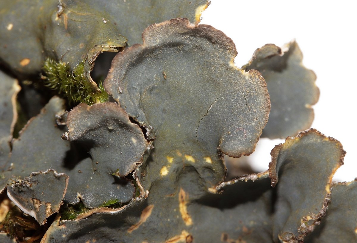 un(e) peltigera poussant sur la mousse épaisse envahissant un tronc de hêtre en montagne debout ; Lobe ne dépassant pas les 2 cm de couleur gris vert ardoisé sans pruine