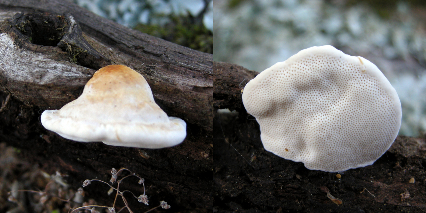 Un tout petit polypore de 3 cm. Un profil d'amadouvier mais plutôt des couleurs de faux-amadouvier. N'ayant qu'une seule réponse, de Jean-Luc Picard, j'avais conclu à cf. Fomitopsis pinicola mais au vu de la taille, de la région, de l'hôte probable, de l'aspect du chapeau et de l'hyménium, ne peut on pas envisager Perenniporia/Truncospora ochroleuca ?