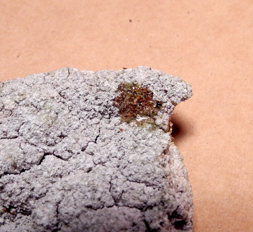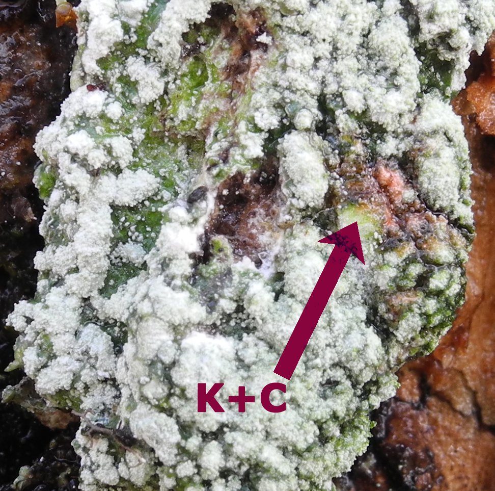 Autre caractère bien marqué, ces soralies se colorent de violet si on leur applique une goutte de potasse, puis une goutte de javel. Mais il faut se dépêcher de regarder (et faire la photo) car cette belle couleur pourpre vire très vite au gris-noirâtre.