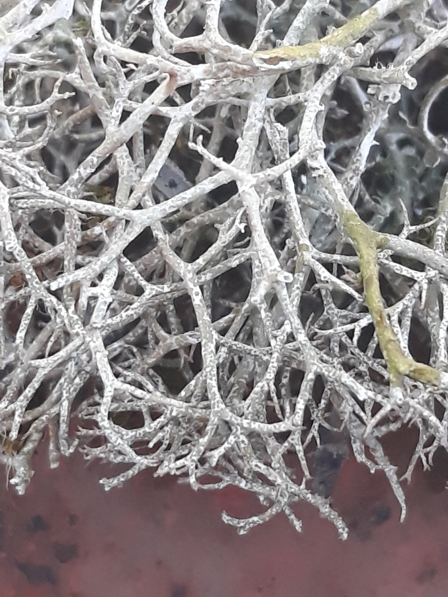 Comme d'hab' quand on rencontre ces podétions ramifiés, sans hyphe du tout, dont les aisselles ne sont qu'exceptionnellement perforées, présentant une surface plus ou moins tachetée de vert, et portant parfois des squamules jusque très haut sur le petit rameau, on peut avoir affaire à C. rangiformis ou C. furcata.
