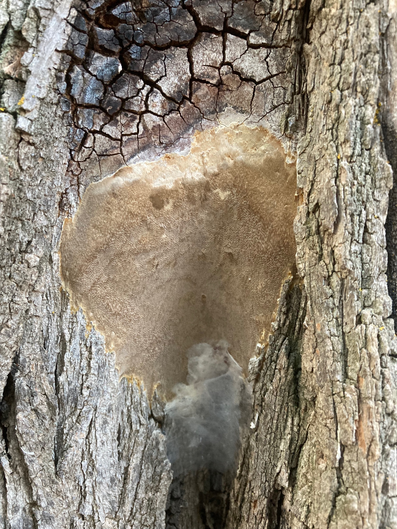 Bonjour, j'ai trouvé cette espèce à tête de Phellin sur un arbre mort dans un terrain de pétanque, il n'y avait que des marronniers mais l'écorce de celui-ci a l'air différente, je n'arrive pas a identifier l'arbre à ce stade, quelqu'un a une idée ? Et pour le champignon je pense sans conviction à Fomitiporia punctata mais sans l'essence je n'y crois pas trop. Il y a plusieurs exemplaires sur le tronc et tous sont très résupinés, seulement un se détachant à peine un peu.