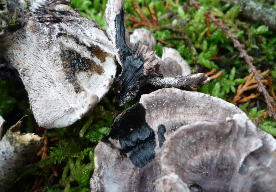 Récoltés il y a une bonne semaine. Troupes nombreuses de ce champignon à aiguillons au bord d'un chemin forestier, côté abies. De l'autre côté du chemin, ce sont des feuillus. A même le sol ou sur la base d'une section de tronc pourrissant. Pas de bleu-noir sur les chapeaux. Chair coriace. La sporée n'a pas donné grand chose, une condensation avec, sans le garantir, une sporée mêlée faible très claire. A la dessiccation (frais, je ne me souviens plus), les champignon sentent très bons, pas loin de la chicorée. Vous pouvez voir la réaction au KOH qui est noir verdâtre sur la dernière photo.