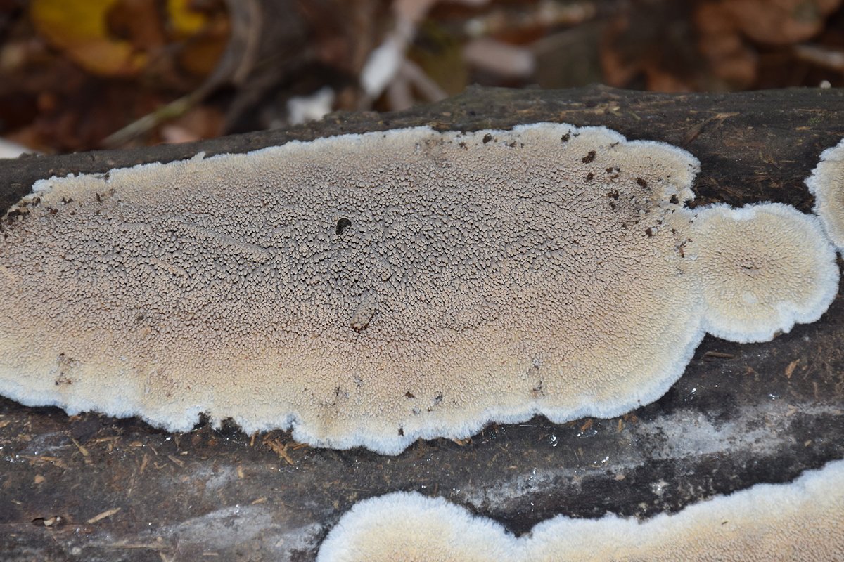 Support sur la face infère d'un tronc couché de feuillu non identifié. Plusieurs croûtes sur plusieurs dizaine de centimètres.