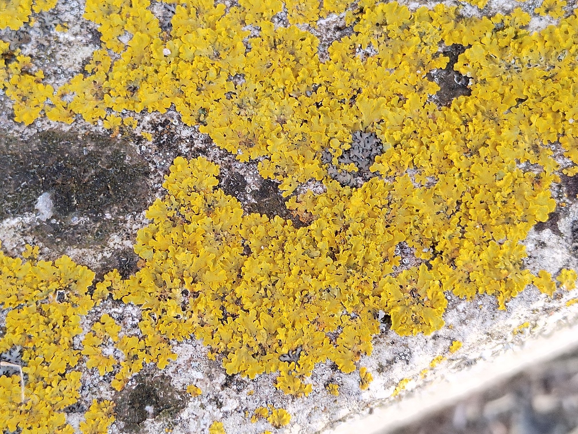 Si ce joli jaune poussin est la vraie couleur de ton lichen, je ne vois rien d'autre que Xanthoria parietina, en dépit d'un manque d'apothécies. On en aperçoit quelques unes, mais ce n'est pas vraiment massif et elles sont très petites