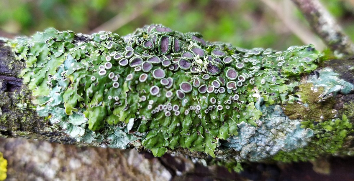 désolé je n'ai que cette image floue faite sous la pluie au smartphone, mais cette petite plaque (maxi 5 cm) vert assez vif avec moult apothécies brunes rougeâtres bien visibles m'a attiré.. Si jamais ça vous parle. Sur branche de chêne..