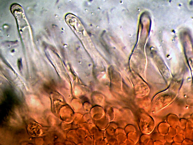 Cheilocistidi: 2: cilindrici, sinuosi, a volte ramificati, (20,86)21,06-24,08-35,79(39,55) × (3,51)3,51-3,51-5,64(6,06) µm.