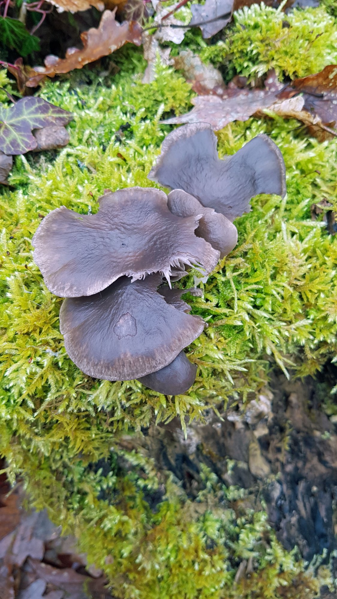 J’ai trouvé un champignon de forme pleurotoïde ce 29 janvier sur une grosse souche moussue de chêne à 500 mètres d’altitude que je n’avais jamais vu auparavent.