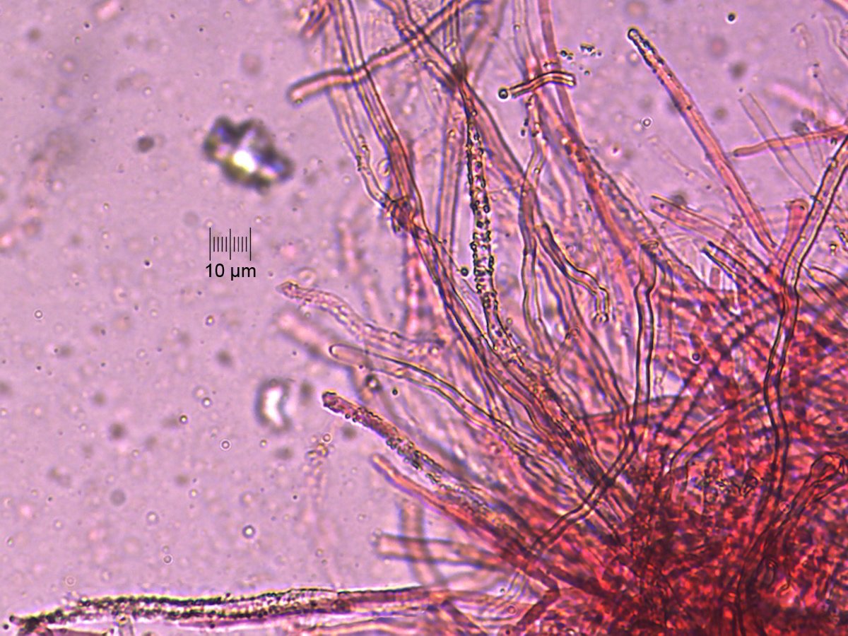La dernière photo, montre des hyphes fortement tortueuses au faible lumen. Je dirais que ce sont bien des hyphes conjonctives. Au début, on voit une longue hyphe squelettique : trimitique donc. La texture résistante élastique, correspond tout à fait.