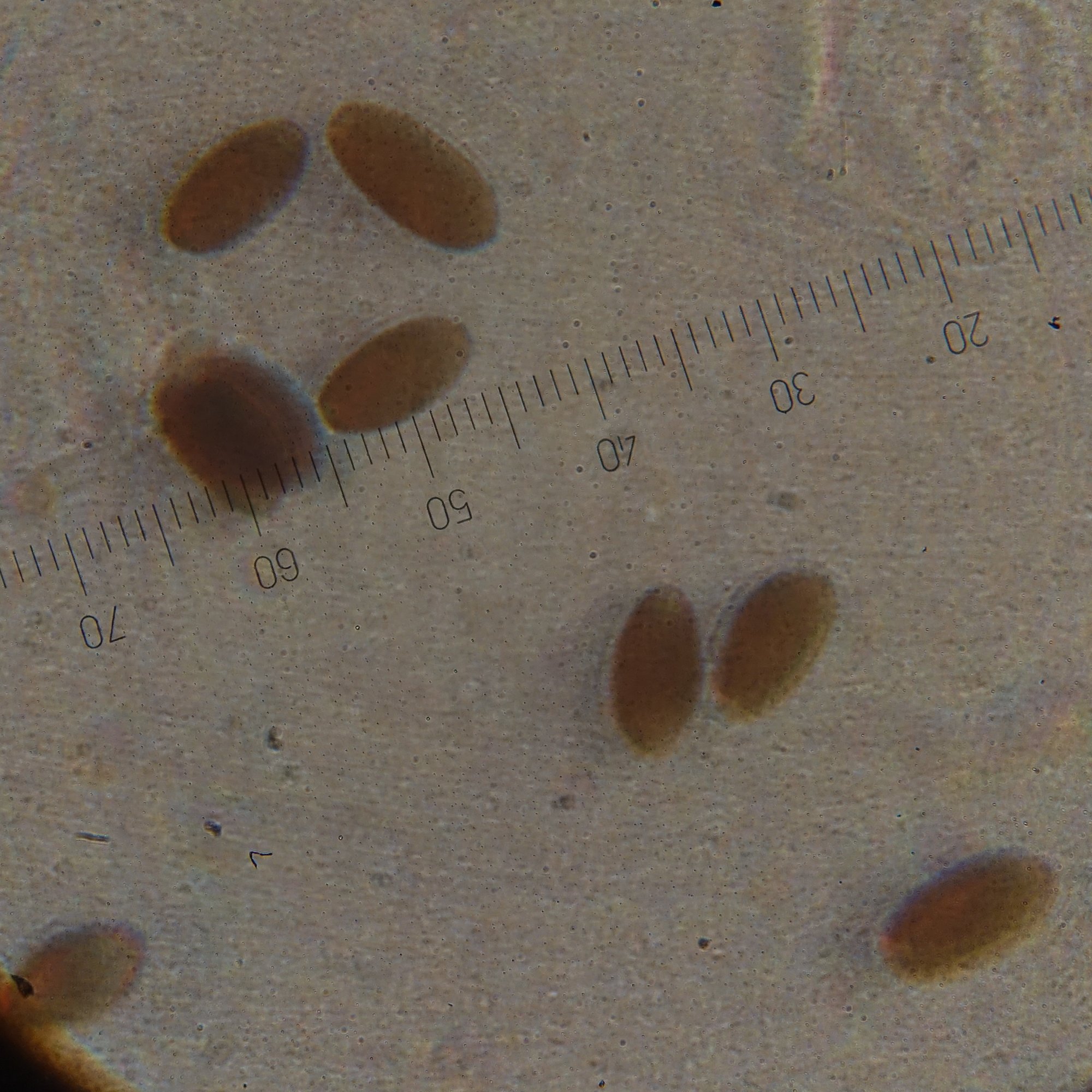 J'essaie d'utiliser Funga Nordica pour faire la determination. On a "Sp on av > 12 µm long" et je dois suivre "Not on dung", "Stem with a pseudorrhiza" et "gill edge red pigmented". Maintenant elle doit être P. corrugis ou P. microrrhiza (P. orbicularis est trop petit et n'a pas assez de rouge sur les lamelles). On a "Veil when young as fibrils, often lacking" vs. "Veil when young as fibrils or flocci" ; pour moi ça favorise corrugis. On a "gill edge often broken by non-pigmented areas" contre "gill edge hardly broken by non-pigmented areas". Ca favorise microrrhiza. On a "moist mature cap rather pale" contre "moist mature cap moderately coloured", ce que je ne sais pas interpréter. Mais chez corrugis on a "Cap ... at first entirely reddish brown" tandis que les chapeaux des petits était bruns ochracés. Les cystides me semblent plutôt rostrés, ce qui favoriserait corrugis. "... on sawdust and wood chips in deciduous forests, .... in parks ..." passe très bien pour microrrhiza mais l'ecologie de corrugis va aussi. La voile sur mon champignon est très peu évident, mais quand je regarde par exemple dans Eyssartier ou Læssøe et Petersen, la voile de microrrhiza doit être assez copieux.
