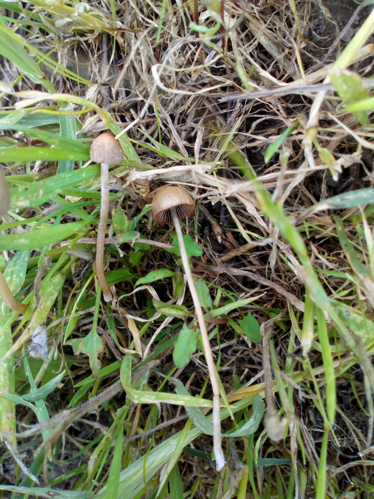 C'est une colle sans microscopie. Je pense que l'on est définitivement dans le genre Psathyrella, mais difficile d'aller plus loin. Je distingue du voile sur le chapeau plus jeune exemplaire, ce qui semble exclure les Panaeolina. Cependant, beaucoup d'espèces ont un aspect similaire macroscopiquement. Je peux par exemple citer : Psathyrella potteri, Psathyrella panaeoloides, Psathyrella complutensis, Psathyrella fusca, Psathyrella microrhiza et Psathyrella sublatispora. Il est à mon avis impossible de discriminer ces espèces sans avoir recours à la microscopie.
