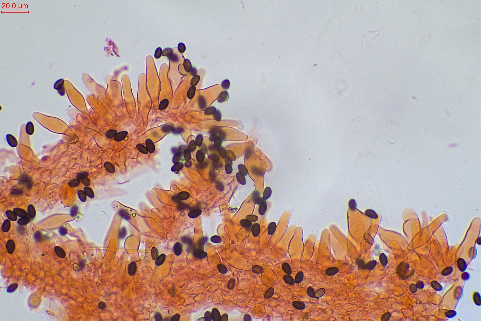 Après avoir cherché, j'ai regardé une seconde fois mes photos micro. Sur l'une d'elle, on distingue quelques gouttelettes verdâtres, mucus ? Les spores détaillées et la possibilité d'un mucus verdâtre va finalement très bien pour la proposition de notre ami Bastic !