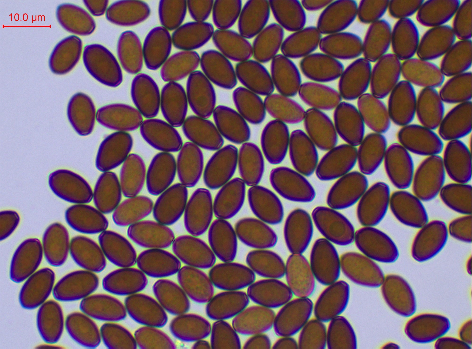 Spores majoritairement brun sombre, elliptiques à subovoïde, certaines rhomboïdes. Non phaséoliformes de profil. Pore germinatif central large de 2 µ. Paroi épaissie.