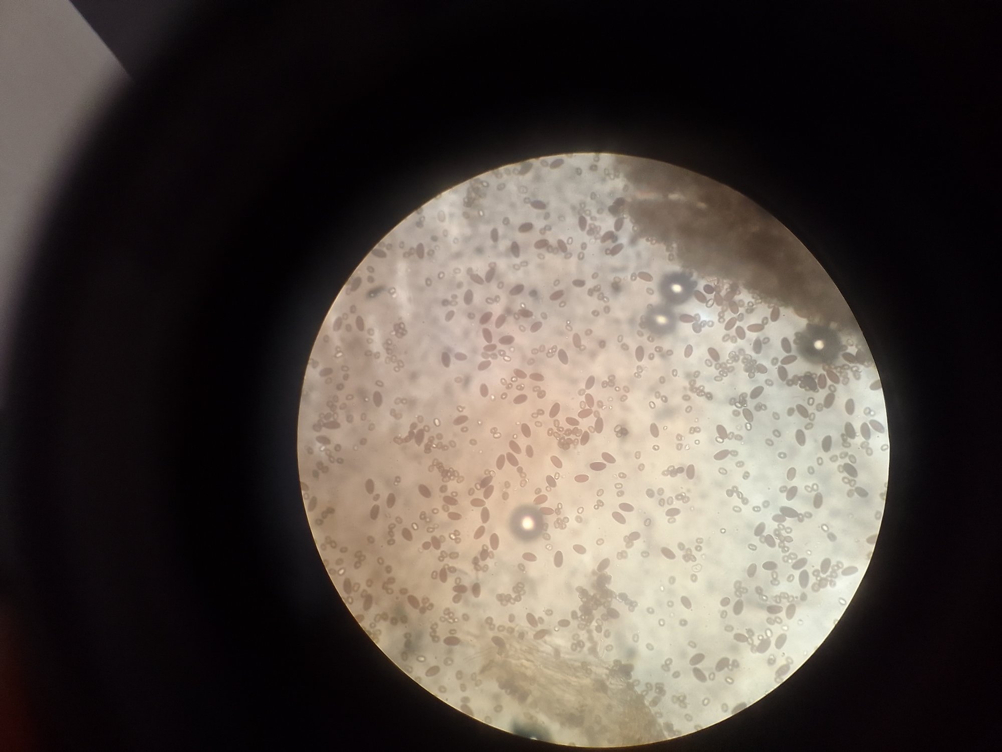 Photos ci-dessous avec spores d'A.bisporus comme témoins. Spores elliptitiques apparaissant brunes noirâtre profond. Arête des lames avec cystides pyriformes et en dessous éléments couchés lagéniformes.