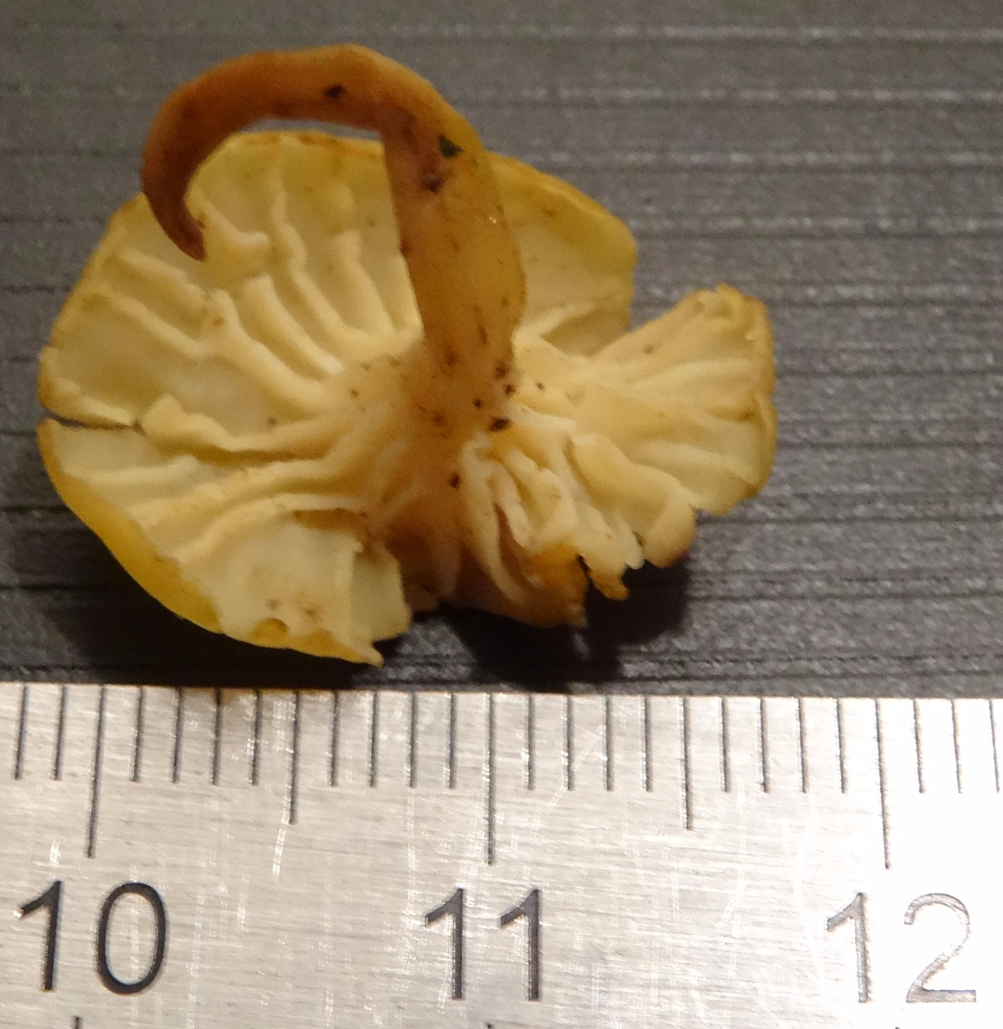 Je me retrouve dépourvu sur l’identification d'une espèce dont 4 spécimens se sont retrouvés dans ma poêlée forestière. C'est après coup en revenant sur le terrain le lendemain et en récoltant à nouveau l'espèce que je me suis dit ce champignon n'est pas une girolle. Je l'ai prise pour telle, car parfois les petites girolles ont des formes improbables à l’état jeune et non définies.