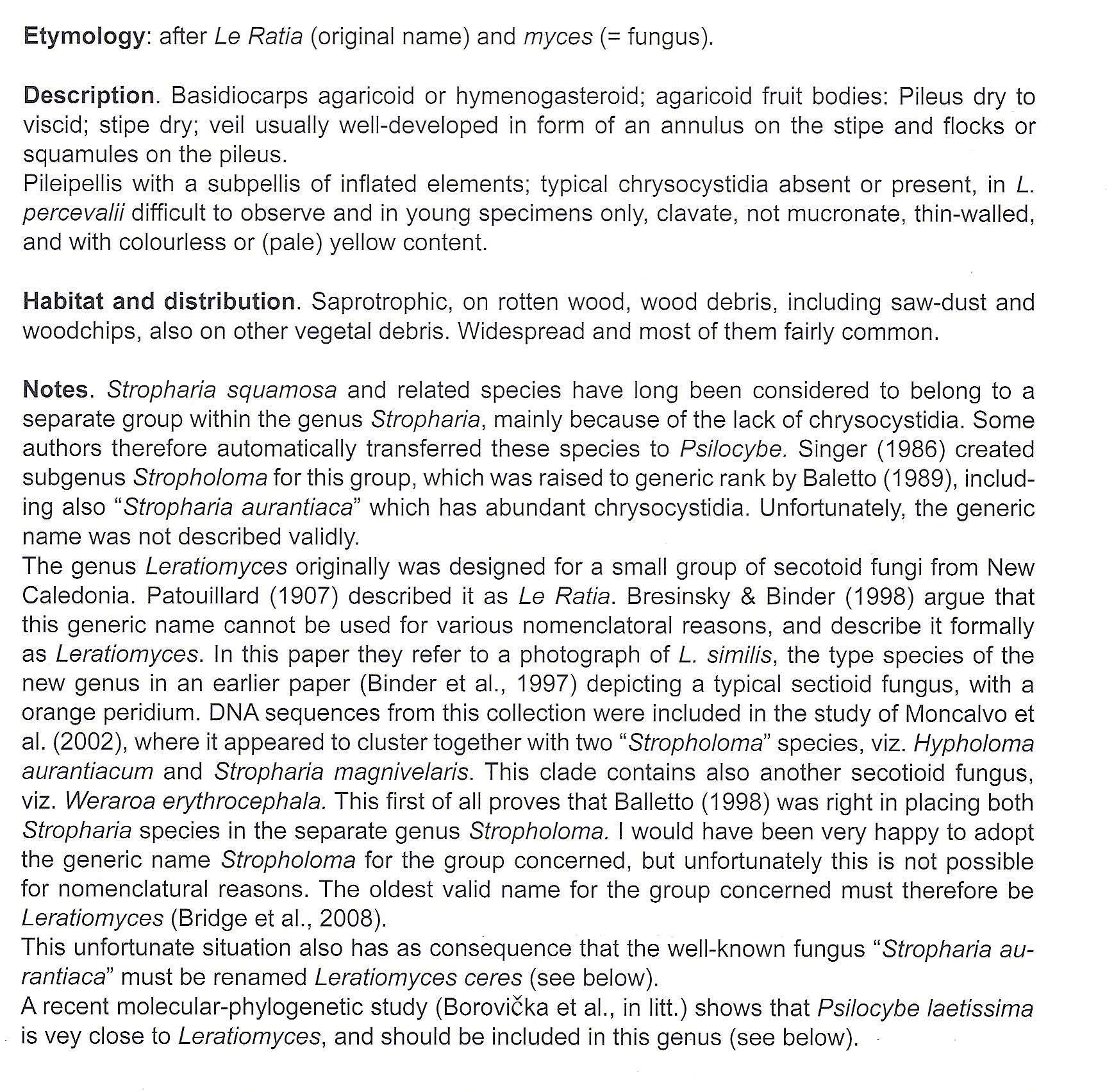 Une seule chose manque (c'est peut-être dans le "see below"), pourquoi Stropharia aurantiaca a t-elle été renommée Leratiomyces ceres et non pas Leratiomyces aurantiaca comme cela se fait habituellement ? Je suppose que la raison en est qu'il y avait en fait deux S. aurantiaca comme Montségur l'a expliqué plus haut. Auquel avons-nous à faire dans ce sujet, c'était la question de Fifi.