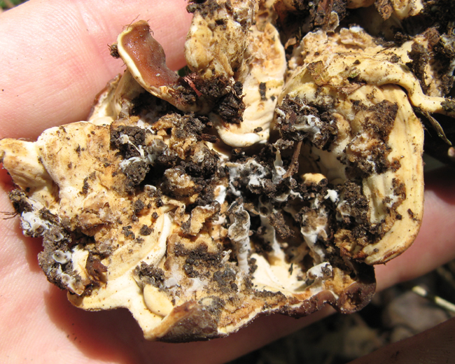 La surface interne est plus jaune beige à l'aspect de velour, on distingue aussi un réseau très fragile de petits "pieds" blanchâtresFace interne plus pâle, garnie de rhizoïdes agglutinant les débris végétaux.