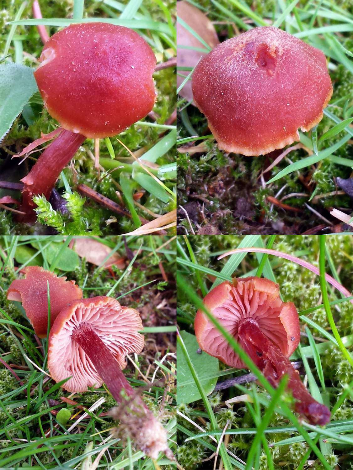 Mais les photos ne sont pas assez belles, retenons plutôt ce petit "hygrocybe" rouge du 3 avril sous l'eucalyptus de mon jardin de Brunoy (Essonne) qui, en le retournant (pas l’arbre), s'est révélé être un laccaire, précisément lié aux eucalyptus : sans doute, comme l'a suggéré LInda à l'époque, Laccaria lateritia :