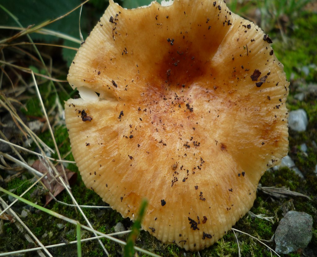 Lames : non blanches, crème à presque un peu saumonées, non piquetées de brun.