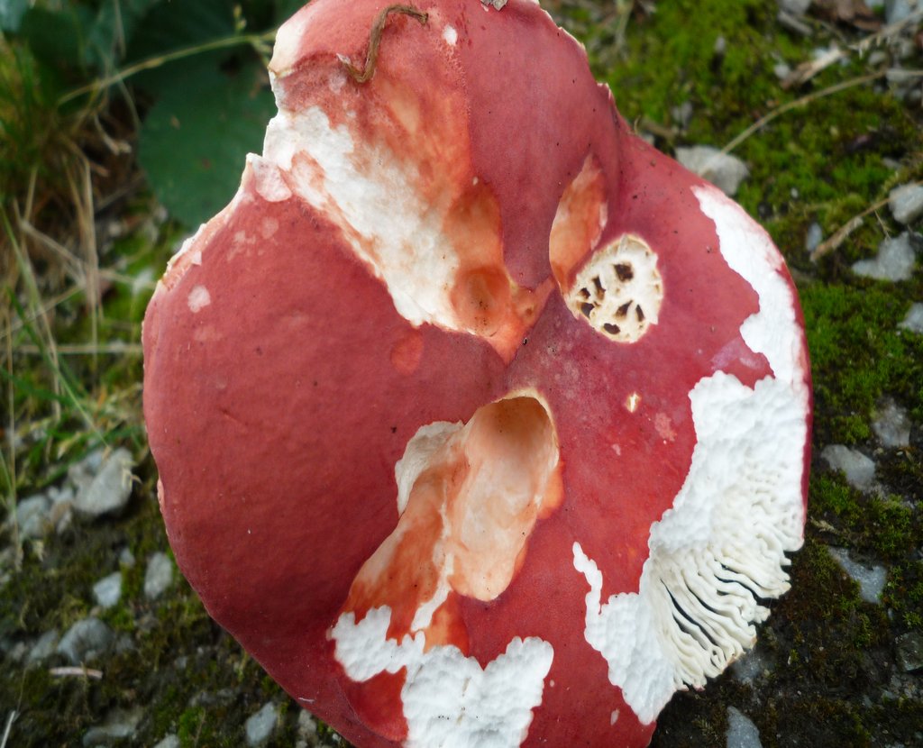 Je remarque cependant qu'une russule R. linnaei pourrait correspondre : le chapeau est de belle taille (non mesuré mais dans les 10 cm), l'arête des lames est légèrement colorée de rouge vers la marge, la couleur rouge est particulièrement criante. Alors, juste une Russula lepida dans sa variabilité ou bien...