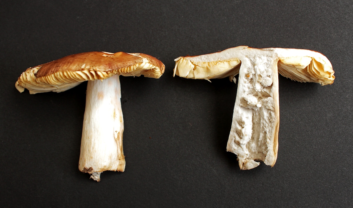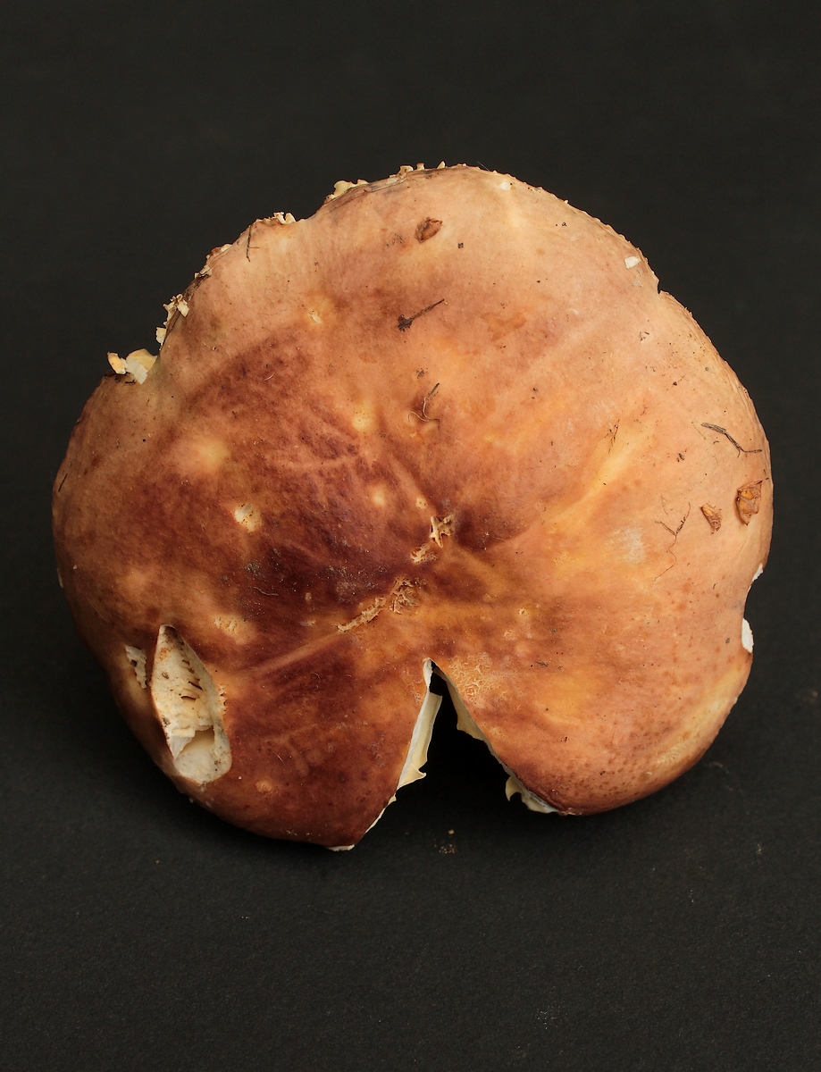 Chapeau : 8 cm, cabossé, brun-orangé-vineux avec des zones crèmes cuivrées.