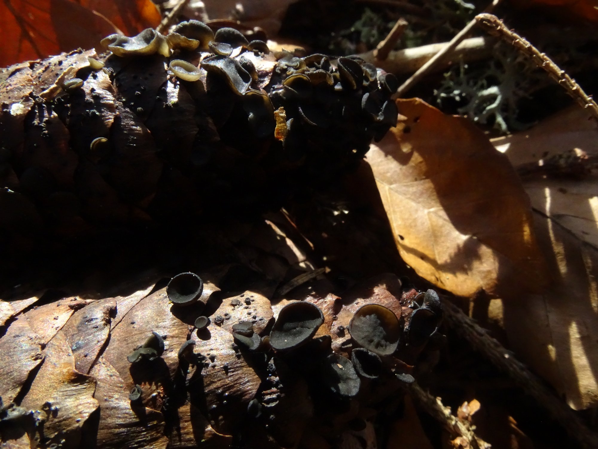 Je renomme ce sympathique ascomycète des cônes d'épicéas, visible juste après la fonte des neiges en montagne.