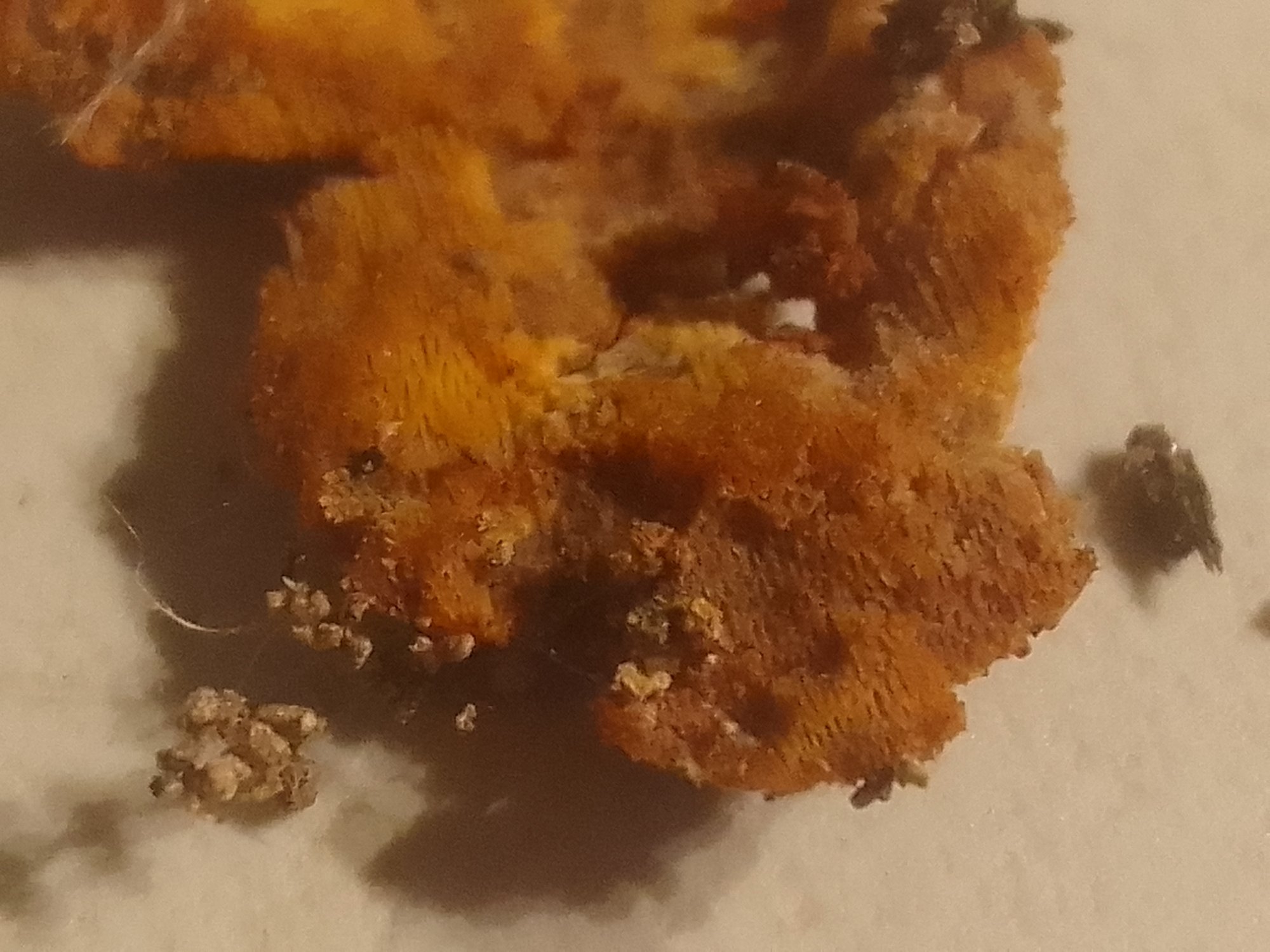 Toucher cireux et brunissant légèrement. Odeur fongique ordinaire. Me fait penser à Scytinostroma hemidicophyticum en beaucoup moins pastel. Et ici des pores semblent apparaître bien que très fins et espacés.