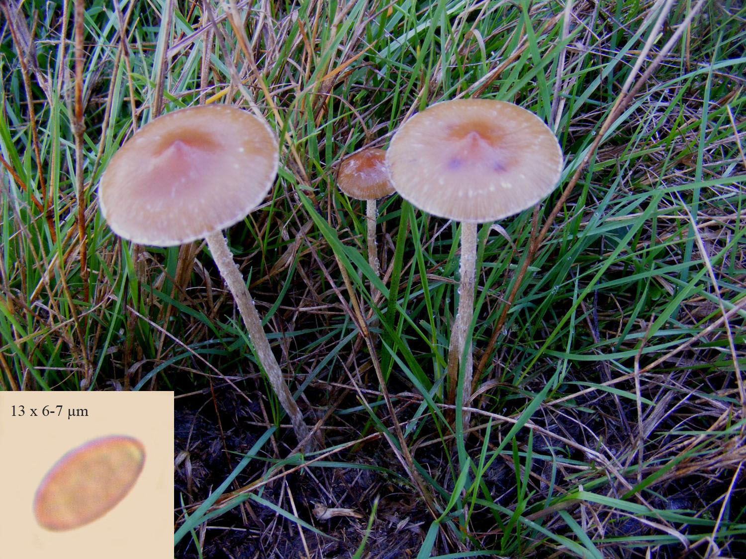 spores. Psilocybe liniformans, another bluing species on horse-dung,