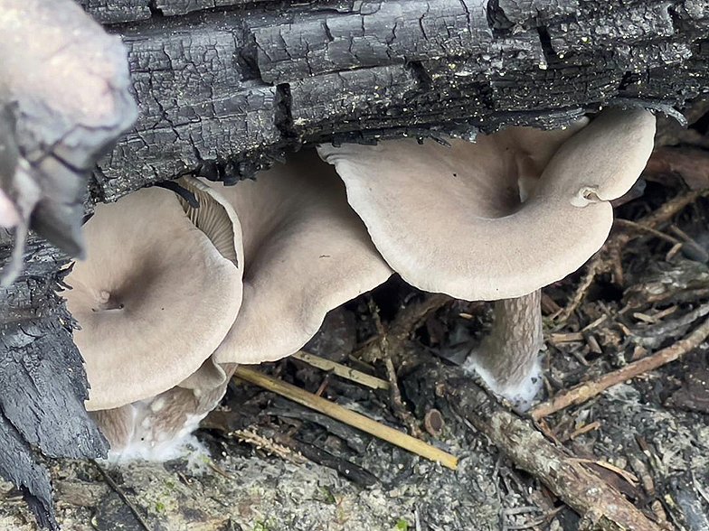 Bonjour, un ami pharmacien m'a rapporté ça hier soir à la séance hebdomadaire du lundi. Un client lui a dit que c'était sur une zone brûlée. Evidemment, ce qui vient tout de suite à l'esprit est Faerberia carbonaria, mais je suis quand même un peu arrêté par l'aspect peu «en trompette», le stipe bien brun et ridé de sombre, les lames pas assez décurrentes, trop serrées, trop colorées, pas anastomosées ni fourchues. La microscopie donne des spores conformes, mais je n'ai pas décelé de lamprocystides avec des cristaux, pourtant signalées dans la littérature (GEPR, Pierre Roux, etc.). Peut-être les ai-je loupées, mais ça m'étonne... Vos avis?