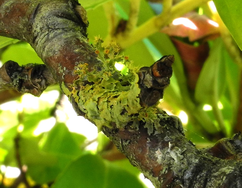 D'ailleurs nous pouvons constater que les thalles sont plutôt à l'abri du soleil vu la coloration tirant sur le vert. Une réaction via la potasse sera très faible vu le peu de xanthones dans le thalle.