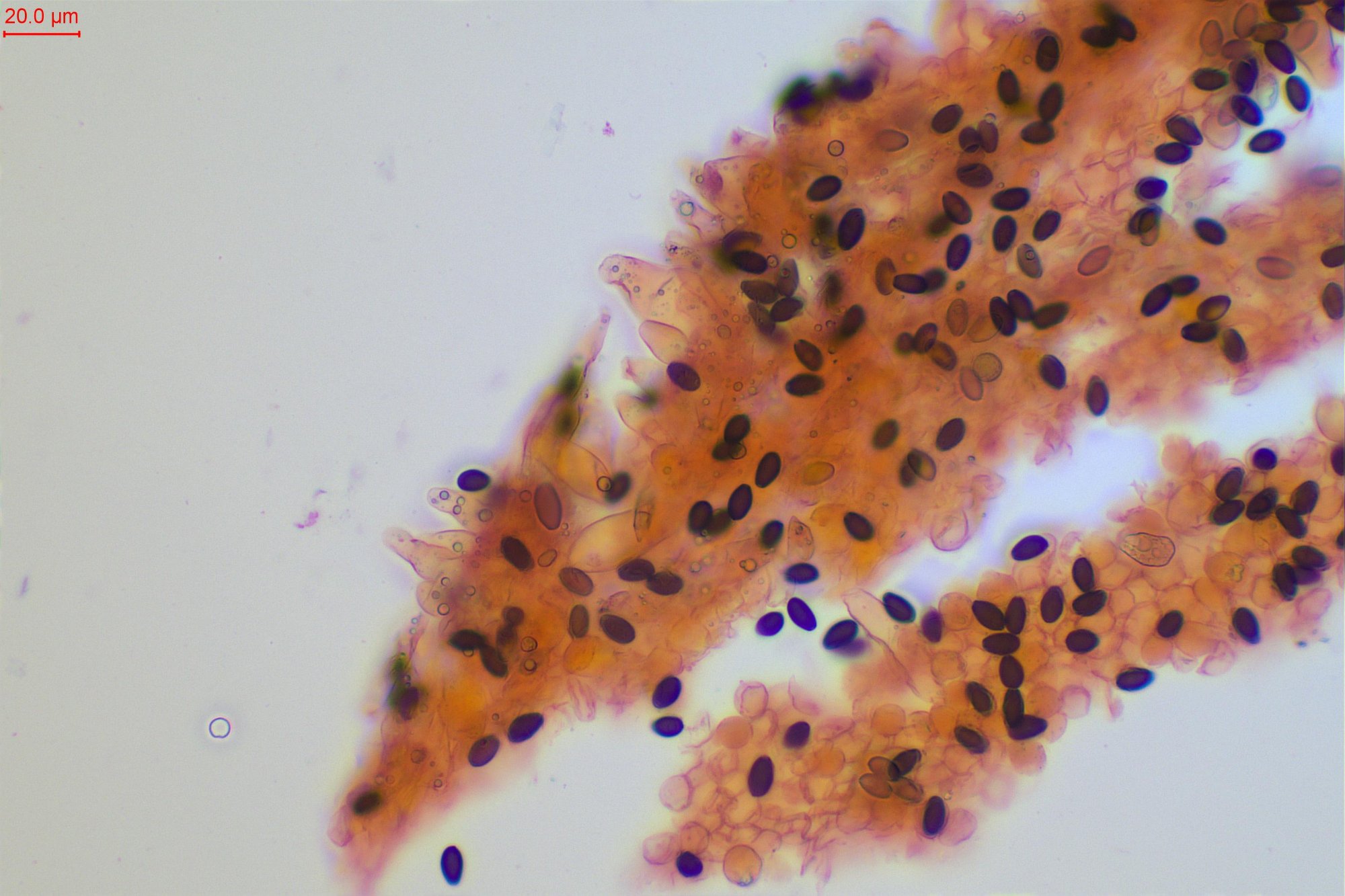 Après avoir cherché, j'ai regardé une seconde fois mes photos micro. Sur l'une d'elle, on distingue quelques gouttelettes verdâtres, mucus ? Les spores détaillées et la possibilité d'un mucus verdâtre va finalement très bien pour la proposition de notre ami Bastic !