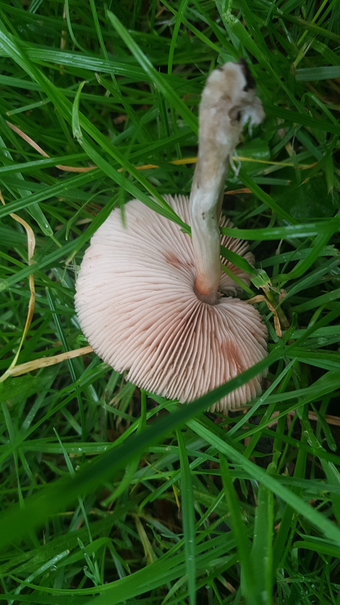 Ce specimen trouvé là où je travaille ce qui m'a permis d'observer les spores au microscope. Je pensais de prime abord avoir affaire à un entolome mais en regardant les lames en coupe transversale, je crois que c'est un Plutée. Un seul autre exemplaire trop vieux à 2 mètres.