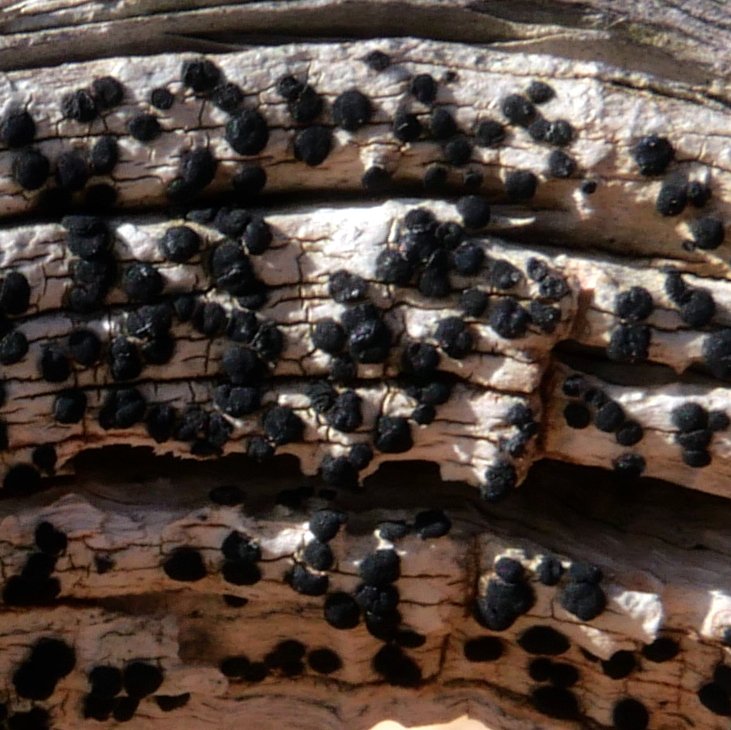 D'abord, le contexte : le sentier côtier au delà de la tour d'Olmeto (Monaccia d'Aullène, C.-du-S.) en direction de Roccapina, le 09/01/21, il y avait kyrielle de romarins : Sur une branchette morte de l'un deux, ces petits points noirs que je n'ai pas réussi à photographier nets : Les "pustules" mesuraient environ 0,5 mm.