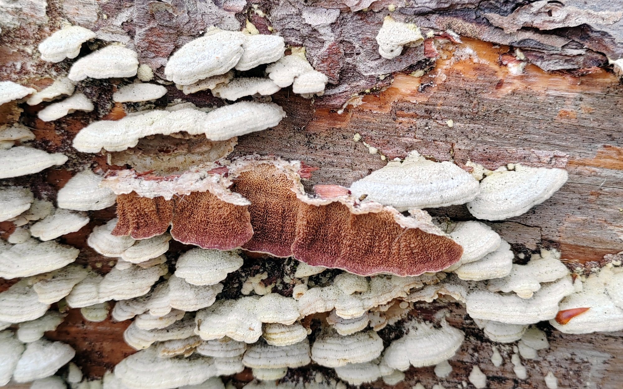 Sur les autres espèces communes en France, si l'on se fie à MycoDB, biforme vient sur feuillus, byssogenum (= Trametes iodes) semble orangé, hollii est quasi-hydnoïde et laricinum vient sur mélèze comme son nom l'indique.
