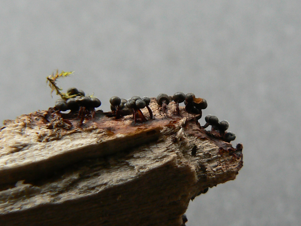 Photo prise 5 jours après, hormis l'aspect plus sec, peu d'évolution en apparence. Sporocyste noir, sur un pied rougeâtre (visible à la loupe).