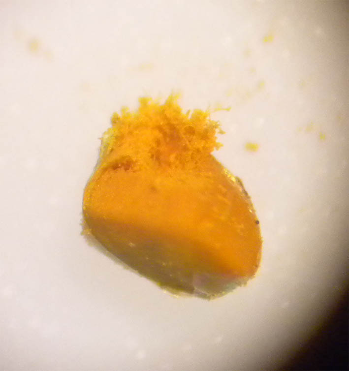Je mets en ligne une photo prise à la bino de mon Mucilago présumé, je n'ai pas eu le temps de microscoper les spores, on devrait interdire les heures sup' au boulot quand un Myxomycète est en pleine évolution