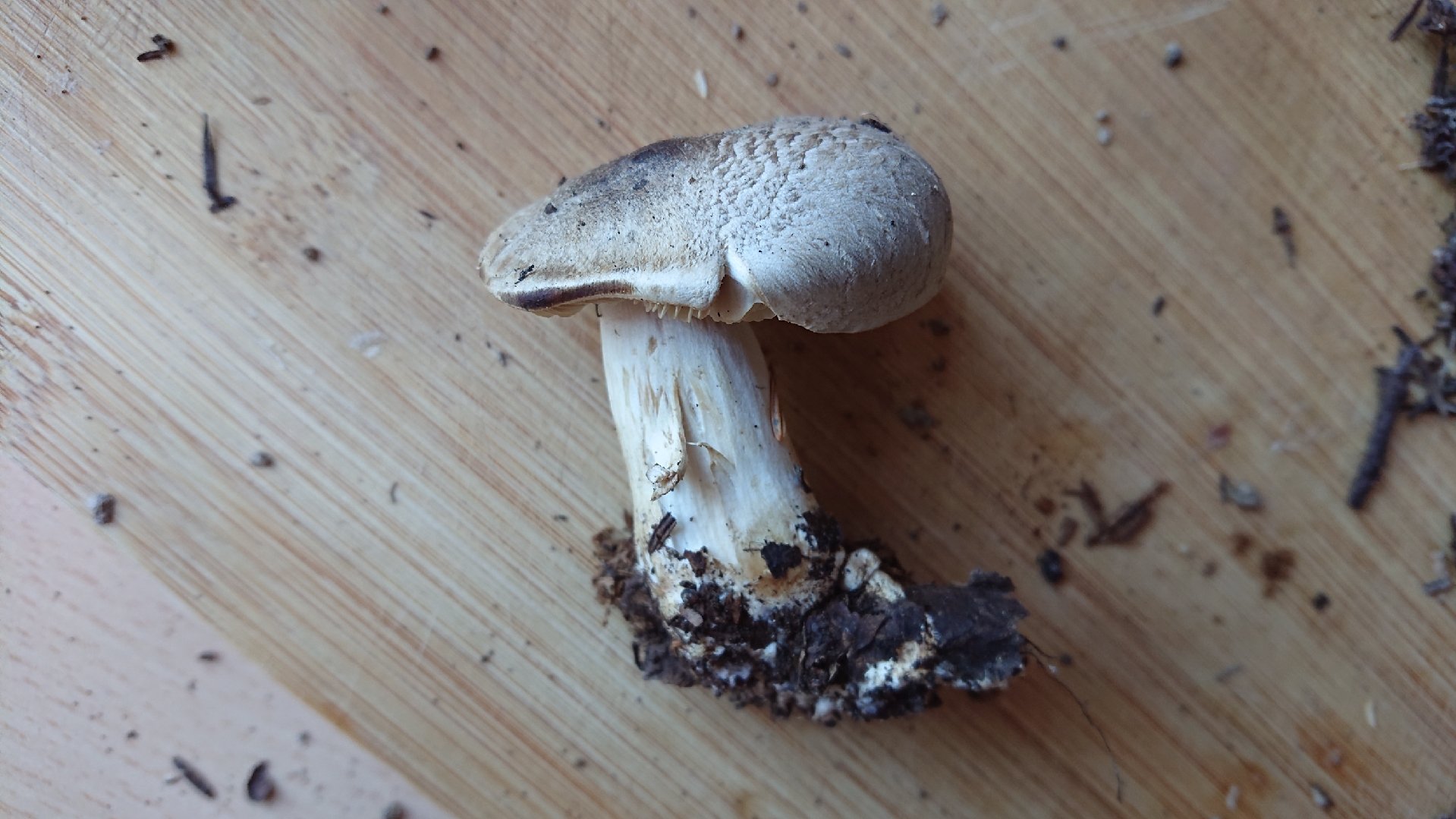 En forêt de sapins et de mélèzes, j'ai trouvé un petit groupe de champignons gris. Les lames échancrées et le chapeau gris à petites mèches m'évoquent immédiatement des tricholomes. Cela dit, les tricholomes gris me paraissent toujours difficiles à distinguer. Je dois préciser que celui-ci est petit (quelques cm), mais qu'il y en avait un identique beaucoup plus imposant à côté (diam. du chapeau : 13 cm).