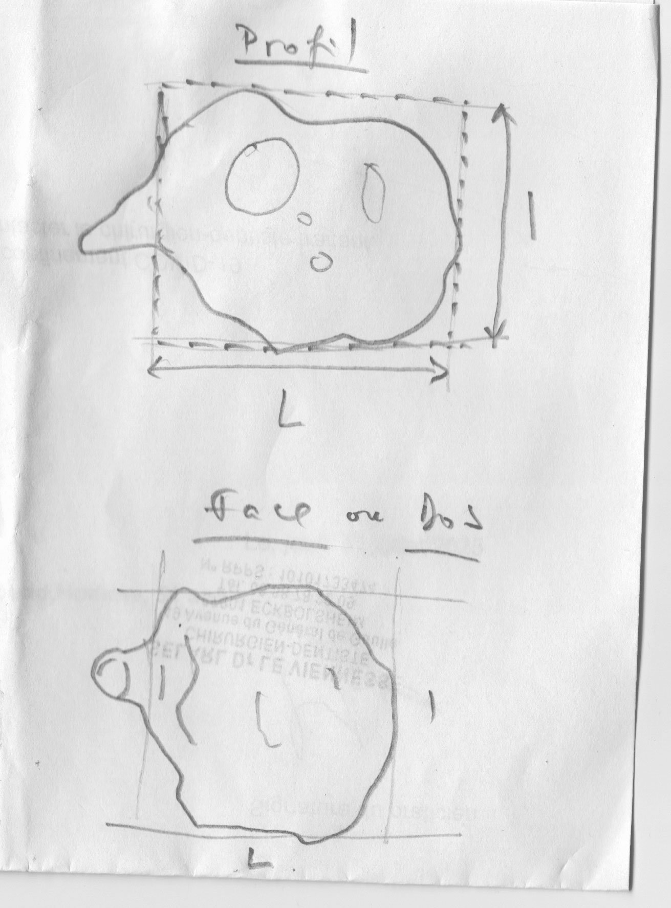 Normalement, enfin selon plusieurs spécialistes, on mesure de profil uniquement car on doit pouvoir bien voir l'apicule afin de s'assurer qu'on mesure pas une spore vue d'au dessus ou d'en dessous , ce qui fausserait la mesure, car on aura en réalité mesuré la largeur et l'épaisseur et non la longueur (L) et la largeur (l). Bref, moi je mesure quand même les spores de face ou de derrière, mais je m'assure qu'elles se présentent bien avec leur longueur. Un petit dessin rapide.