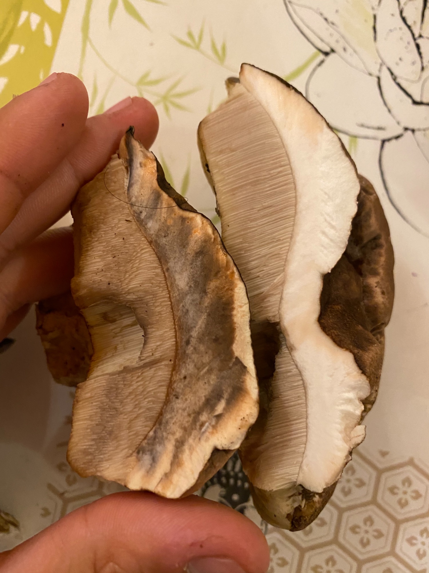 Si vous le souhaitez je peut vous fournir d’autres photos des champignons ce soir dont une coupe longitudinale du sommet du chapeau au bas du pied à l’instant de la coupe et quelques minutes après ainsi que des photos du site de ramassage avec les essences d’arbres présentes sur place :)