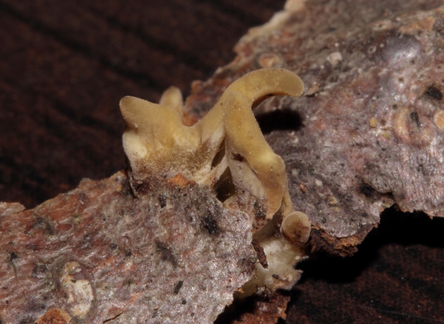 La forme originale est peut-être due à une croissance contrariée, l'aspect m'évoque un jeune Stereum.
