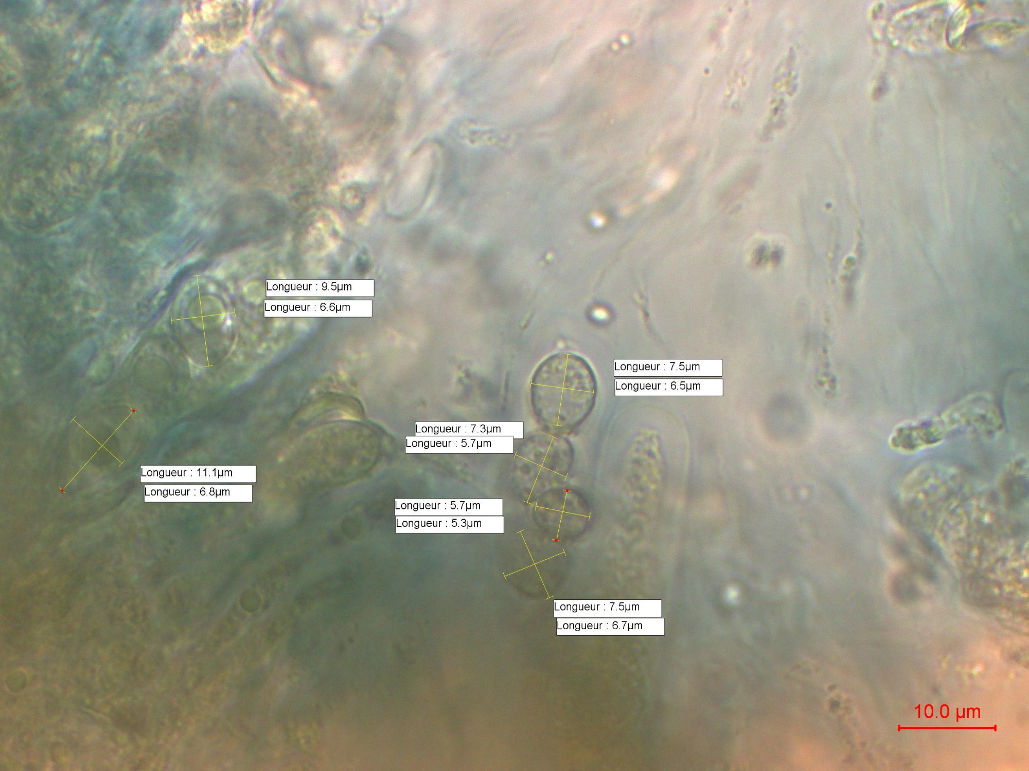 Je n'ai bien évidemment pu confirmer l'espèce que par l'examen des spores ce qui a l'avantage de ne pas déboucher sur un cf.