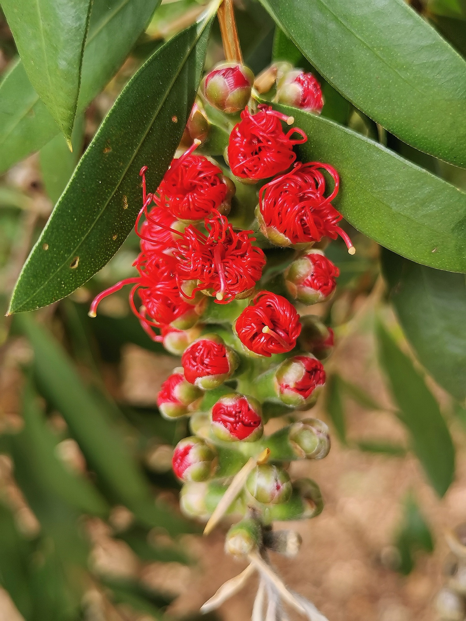 L'espèce apparemment la plus courante que je mentionnais est Melaleuca citrina (Wikipédia), dont le taxon valide serait Callistemon citrinus pour GBIF alors qu'en revanche Catalogue of Life reclasse tous les Callistemon dans le genre Melaleuca...