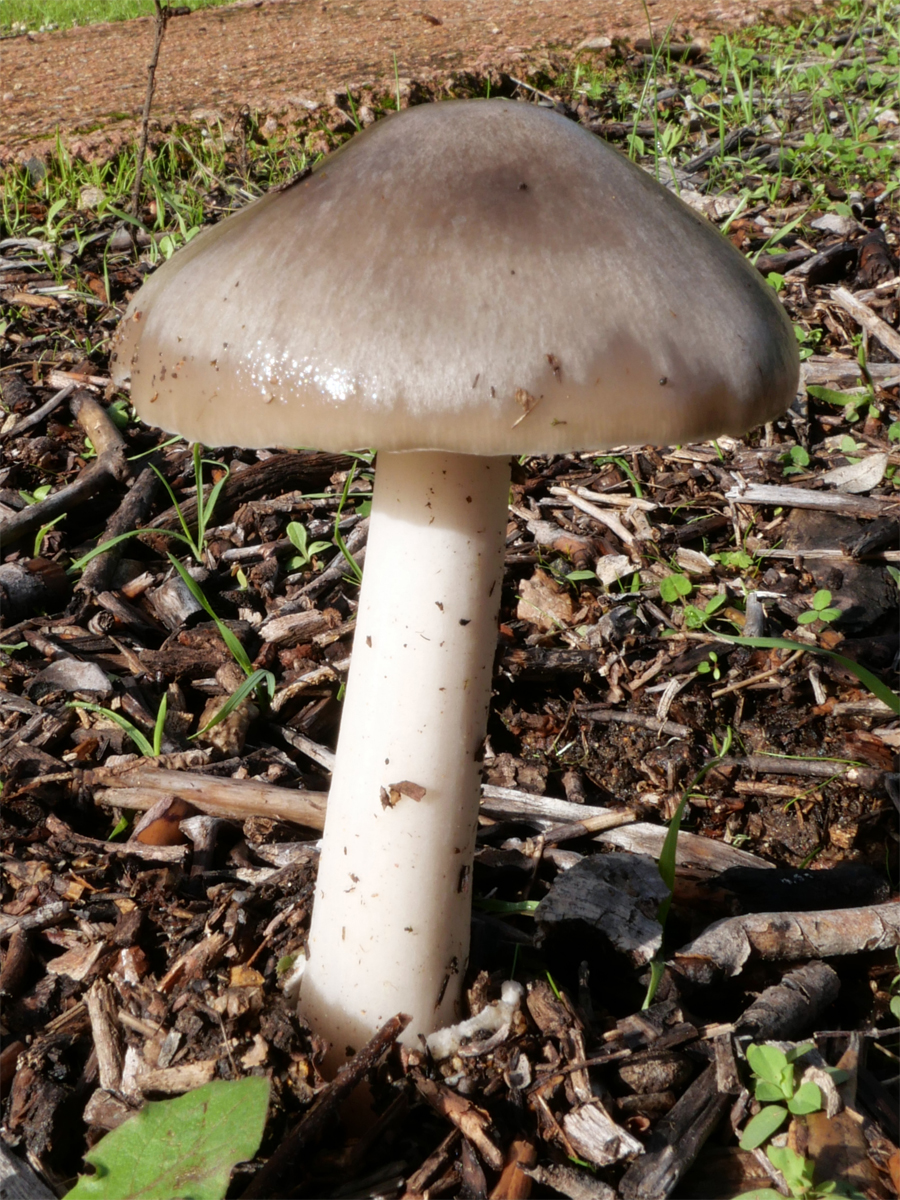 C'est bien sûr Volvopluteus gloiocephalus, que j'appelle toujours Volvariella gloiocephala. Pour les vrais débutants, on voit ci-dessous la volve, l'absence d'anneau, les lames rosissantes qui signent le genre volvaire.