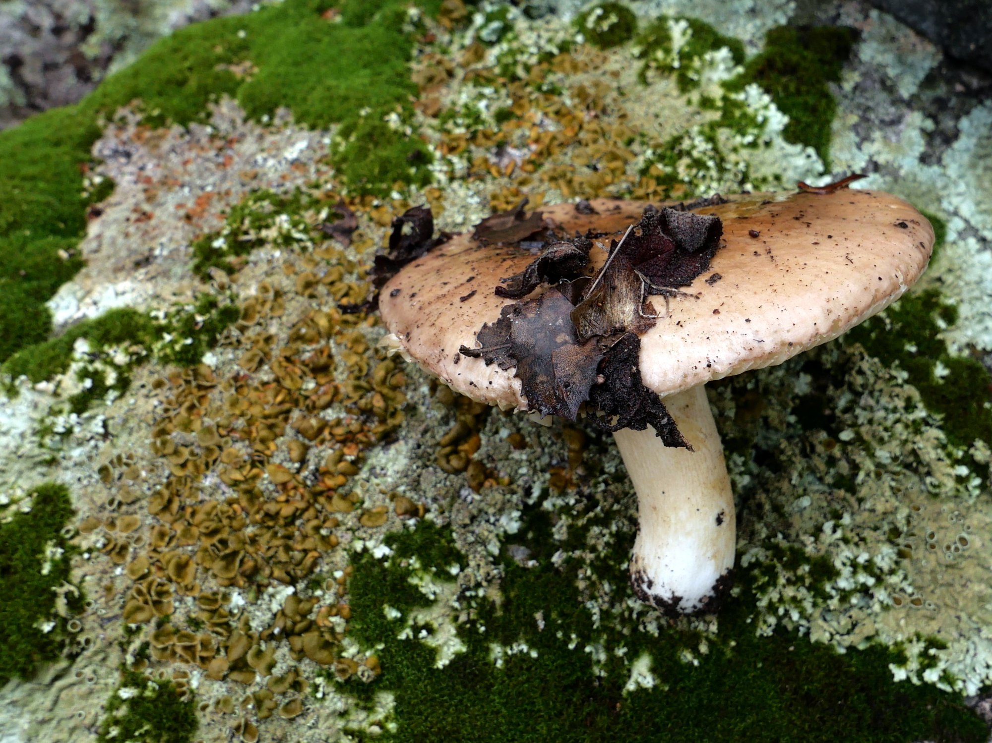Non, n'essayons même pas, Castor, c'était juste pour te faire visiter les lichens. Elle fait partie des russules que j'ai photographiées en passant mais dont le soir j'avais oublié le goût et l'odeur, ce pourquoi je ne l'ai pas présentée. Je l'ai juste mise ici parce les lichénologues se demandaient si la tronche des apothécies n'était pas due à un champignon