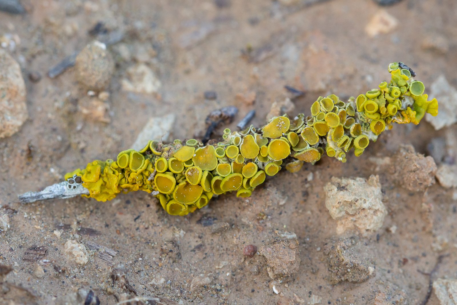 Je dirais Xanthoria parietina... mais en regardant sur le site Lichens marins j'ai un doute avec Polycauliona polycarpa = Xanthoria polycarpa, car je ne vois pas trop les lobes sur mon lichen. Sur la gauche de la branchette, on en voit un peu, certains sont larges et plats, d'autres moins.