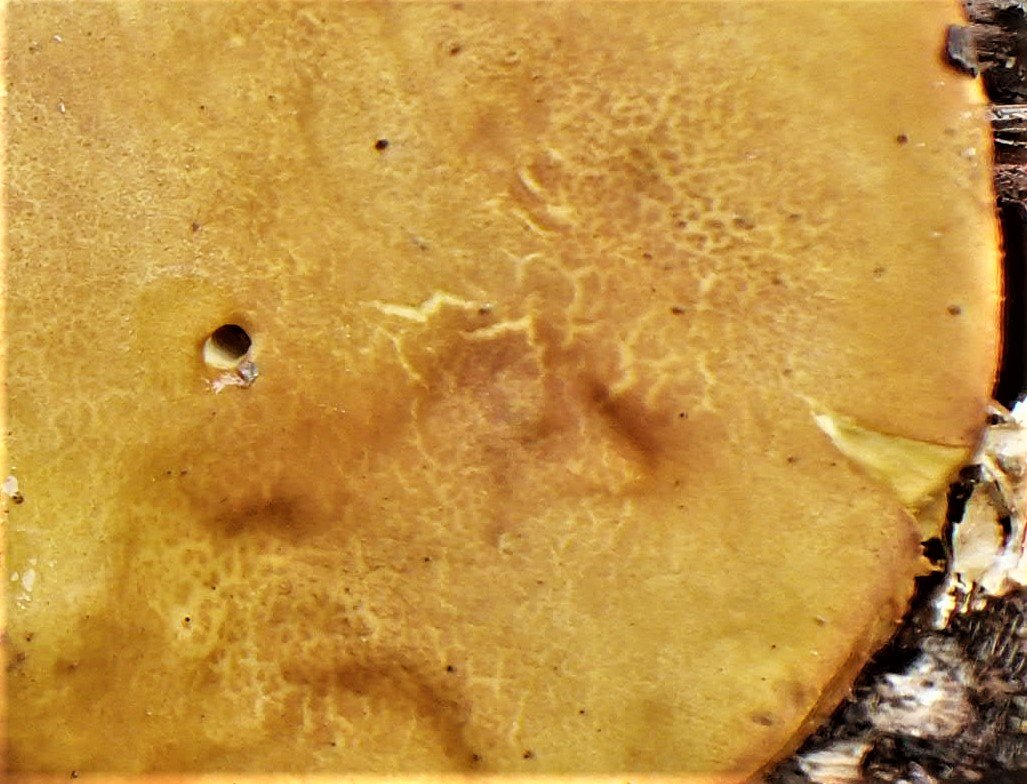 J'ai encore des doutes. Je suis particulièrement gêné par la couleur jaune du stipe, les tons roses dans la chair du chapeau, la forte couleur jaune dans la chair du stipe et l'absence d'une "ligne Bataille" brunâtre entre la chair du chapeau et les tubes (ici: jaune-vert). De plus, les tubes se déchirent dans le sens de la longueur (=>type Phylloporus). Les espèces d'Aureoboletus ont des parois tubulaires de type Boletus, ce qui signifie que lorsqu'elles se cassent, elles restent entières.